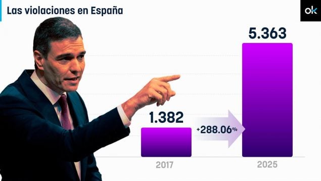 El Gobierno marcha este 8M, Día de la Mujer, con las violaciones multiplicadas por cuatro desde que Pedro Sánchez es presidente. Se han disparado nada menos que un 288% desde que gobierna el feminista Sánchez, pasando de 1.382 en 2017 hasta la escalofriante cifra de 5.363 en 2025, según los propios datos del Ministerio del Interior que recientemente se han publicado en el balance de criminalidad de 2025.
