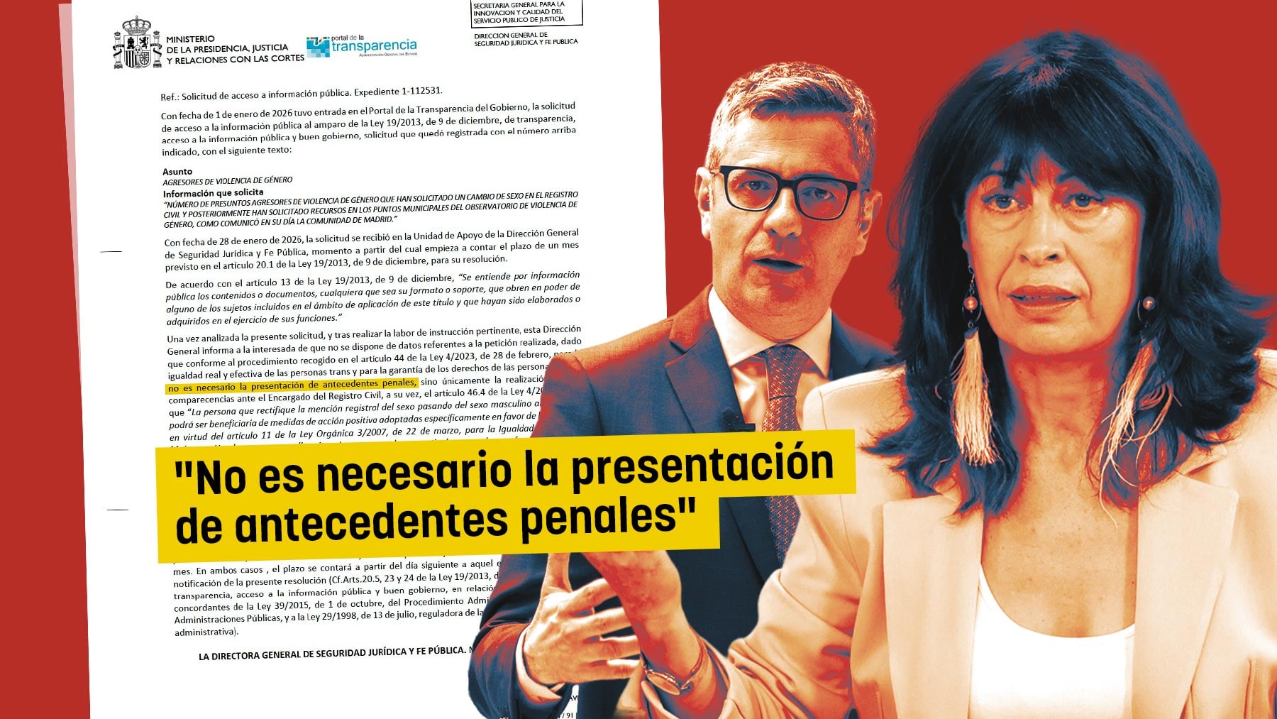Ahora, en respuesta a este periódico, el Ministerio de la Presidencia, Justicia y Relaciones con las Cortes -a través de la Dirección General de Seguridad Jurídica y Fe Pública- reconoce que «no se dispone de datos» sobre los maltratadores que podrían haberse acogido a la Ley Trans dado que «conforme al procedimiento no es necesario la presentación de antecedentes penales sino únicamente la realización de dos comparecencias ante el encargado del Registro Civil».
