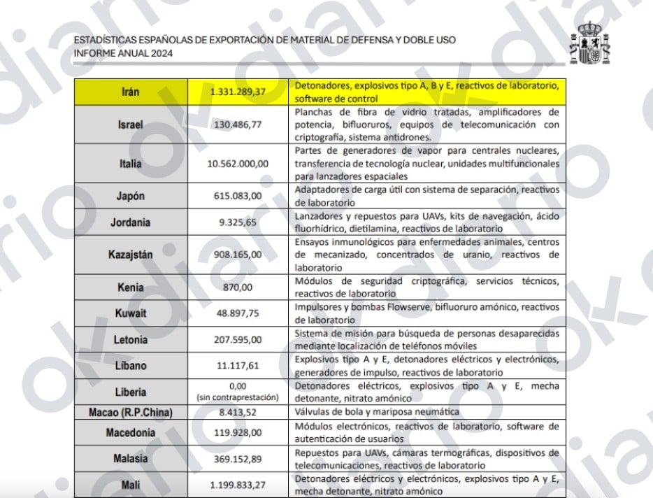 En cuanto al primer semestre de 2025, el Ejecutivo autorizó exportar material de «doble uso» a Irán por 200.000 euros dentro de la categoría 1 de «equipos de protección y detección, máquinas para el devanado de filamentos, fluidos y sustancias lubricantes, fluoruros, sulfuros, cianuros y derivados halogenados».