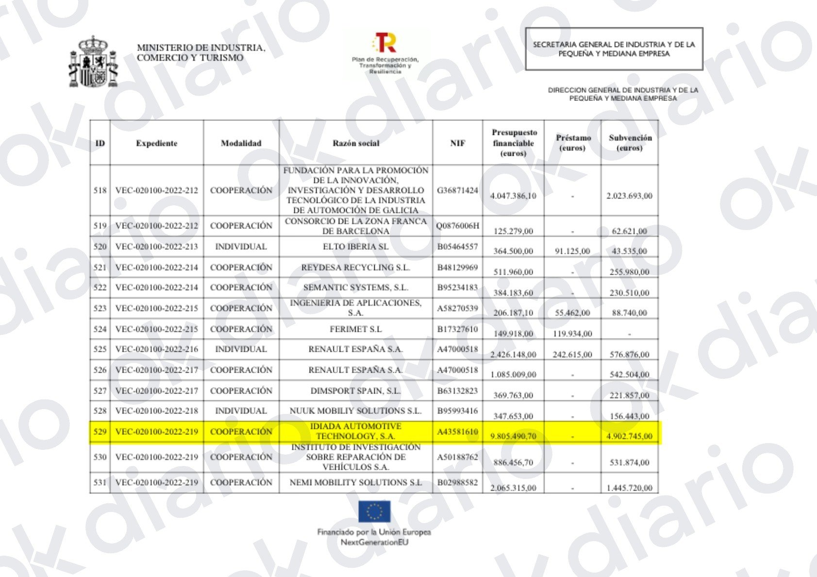 Esta convocatoria fue relativa a la «concesión de ayudas PERTE VEC», también dentro del Plan de Recuperación sufragado con dinero comunitario. De igual modo, el Ministerio de Industria asignó entonces a Idiada otras dos partidas, de 211.197 y 3.338 euros, pertenecientes a la misma convocatoria. En total, todas estas ayudas suman 5.239.263,82 euros.