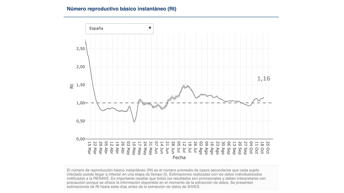 El gráfico del ISCIII refleja el «número de reproducción básico instantáneo» (Rt), que indica el número promedio de casos secundarios que cada sujeto infectado puede llegar a infectar en una etapa de tiempo determinada.