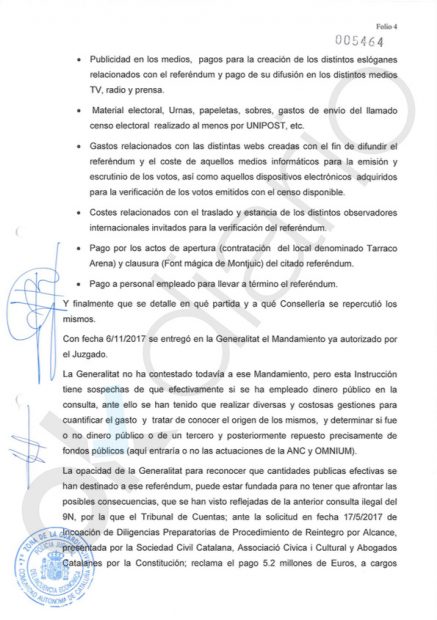 La Guardia Civil remitió el pasado 20 de noviembre un informe al Juez del 13 de Barcelona en el que ya afirmaba lo siguiente: «La Generalitat no ha contestado todavía» a los mandamientos de requerimiento de información sobre sus rutas de dinero, «pero esta Instrucción tiene sospechas de que efectivamente sí se ha empleado dinero público en la consulta». Los agentes realizaban ya en ese informe una descripción del esquema de triangulación preparado para despistar los controles del Gobierno en el desvío de fondos públicos hacia fines ilegales: «Si fue o no dinero público o de un tercero y posteriormente repuesto precisamente de fondos públicos (aquí entrarían o no las actuaciones de la ANC y Òmnium)».
