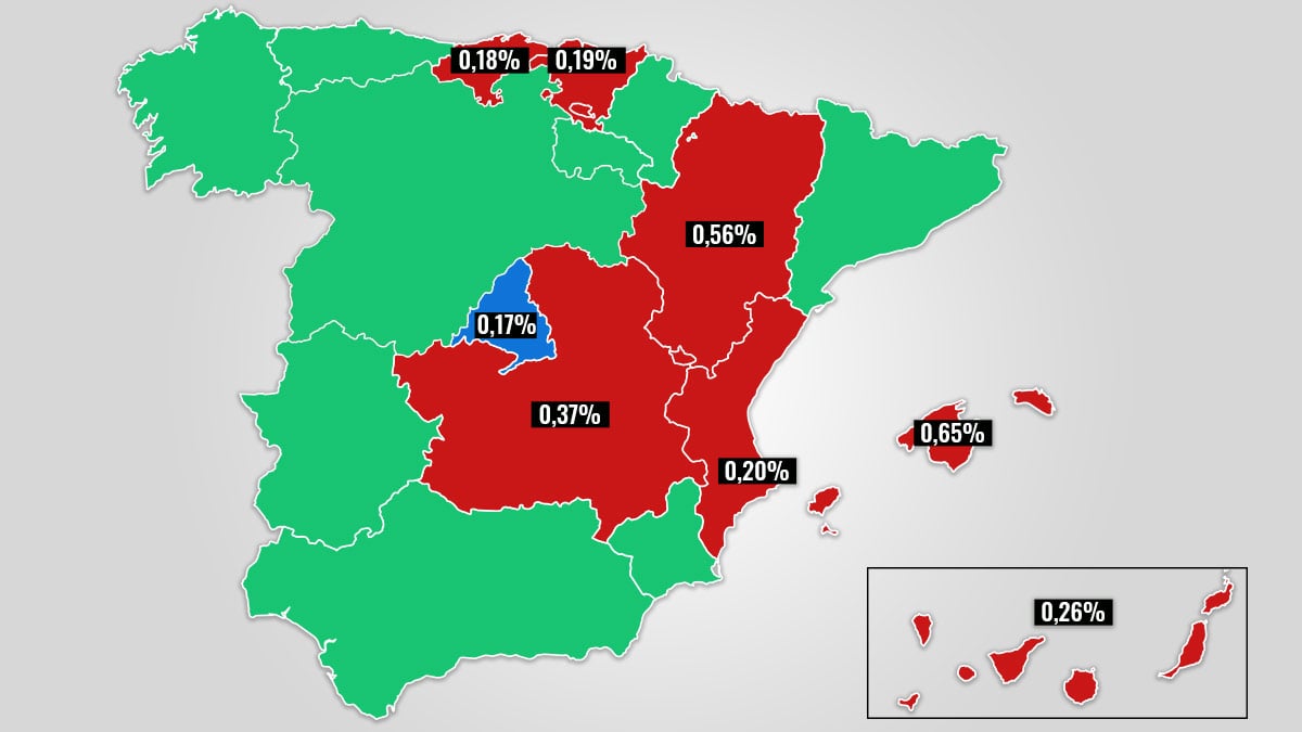 La Comunidad de Madrid notificó este miércoles 112 nuevos contagios en un día, lo que supone un incremento del 0,17% en lo que respecta a casos confirmados mediante pruebas PCR. Este porcentaje es inferior a la media, en el 0,18%, y también menor a otras regiones que sí han podido avanzar en la desescalada. Es el caso de Baleares, que actualmente lidera la tasa de incremento diario (0,65%), Aragón (0,56%), Castilla-La Mancha (0,37%), Canarias (0,26%), Comunidad Valenciana (0,20%), País Vasco (0,19%) y Cantabria (0,18%).