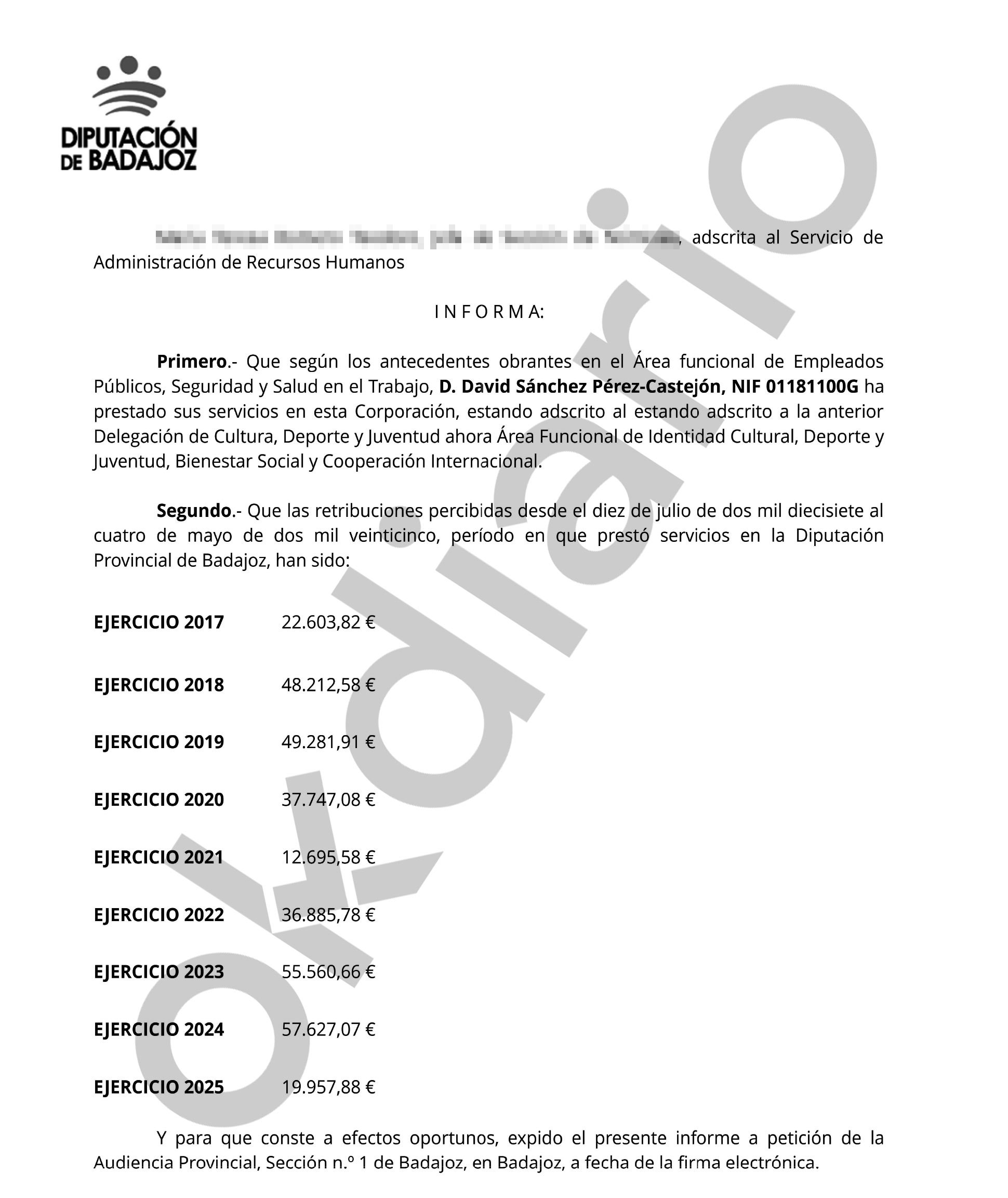 David Sánchez, el hermano del presidente del Gobierno cobró 340.572 euros de la Diputación de Badajoz entre julio de 2017 y mayo de 2025, según se desprende de un documento oficial de la administración pacense, al que ha tenido acceso OKDIARIO. Primero cobró como coordinador de las actividades de los conservatorios de la administración pacense y después como jefe de la oficina de artes escénicas.
