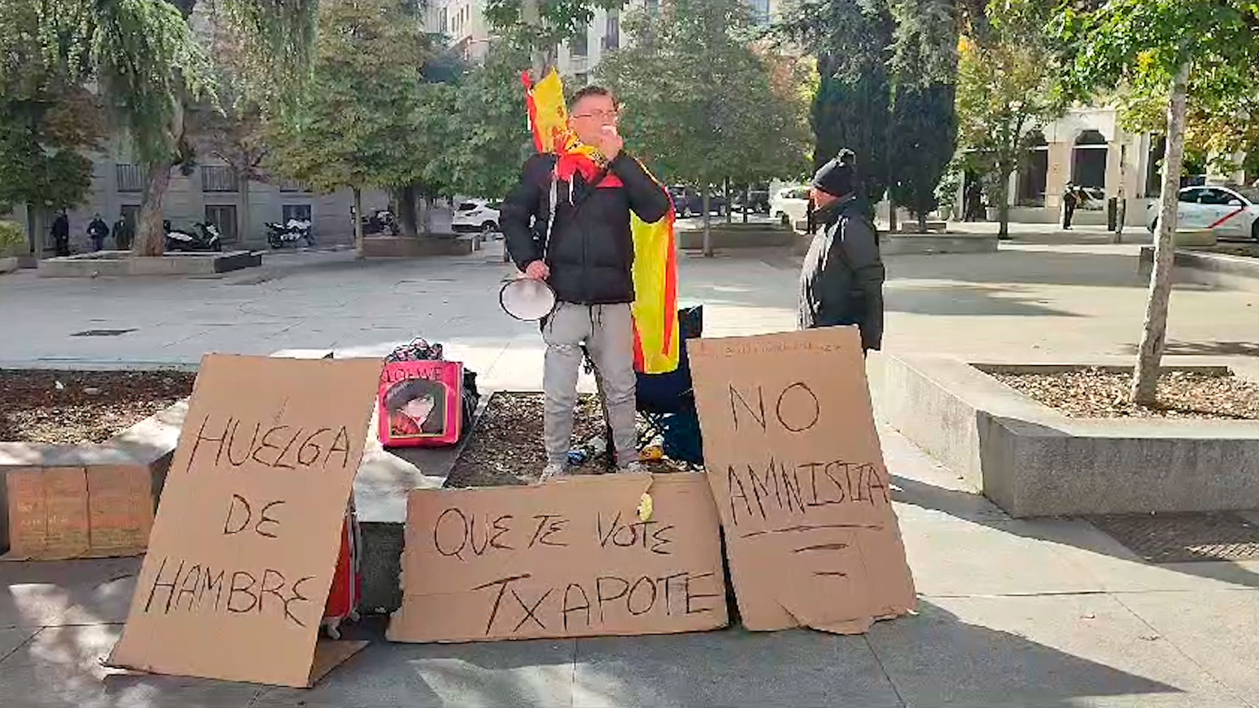 Adán está presente en la plaza de las Cortes con varios carteles en los que puede leerse «Que te vote Txapote», «No amnistía» y «Huelga de hambre». El hombre encadenado frente al Congreso cuenta con un megáfono con el que grita esas mismas proclamas además «Sánchez vete ya, el pueblo no te quiere».