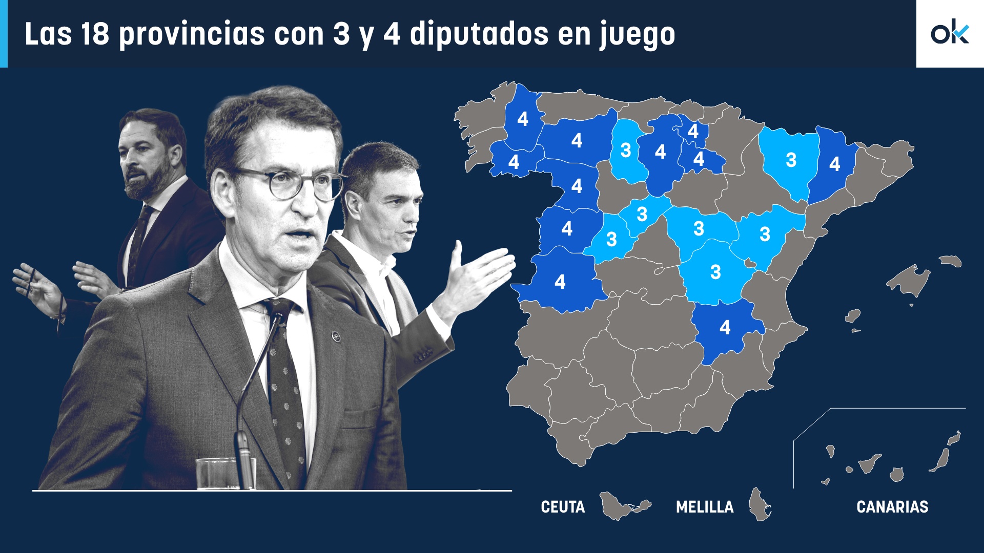 El PP de Alberto Núñez Feijóo considera trascendental para las generales del 23 de julio reunir el voto útil en 18 provincias españolas, que son todas aquellas circunscripciones electorales donde están en disputa 3 y 4 diputados, principalmente entre populares y socialistas, mientras que Vox tiene menos opciones de lograr representación, con el riesgo de que las papeletas a la formación de Santiago Abascal no se traduzcan en escaños.
