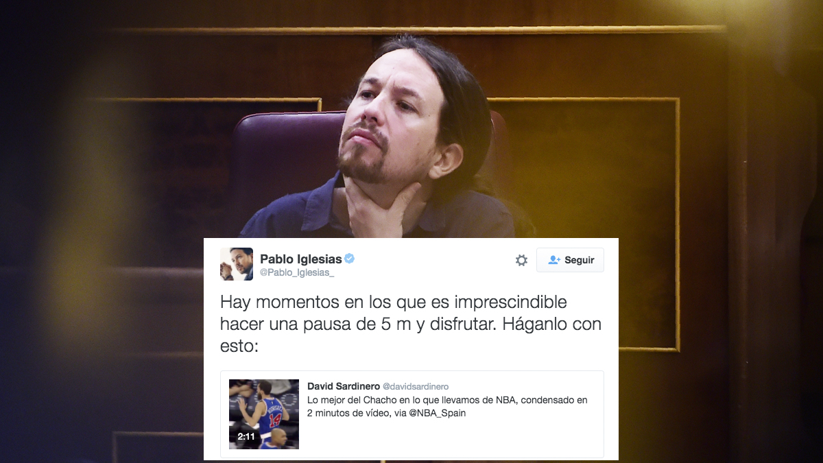 A esto hay que añadir que no parece que Iglesias tuviera asuntos urgentes que atender. En pleno debate sobre el futuro de la norma fundamental del Estado, se puso a tuitear confesando que estaba viendo vídeos de la NBA, que compartió: «Hay momentos en los que es imprescindible hacer una pausa de 5 minutos y disfrutar. Háganlo con esto».