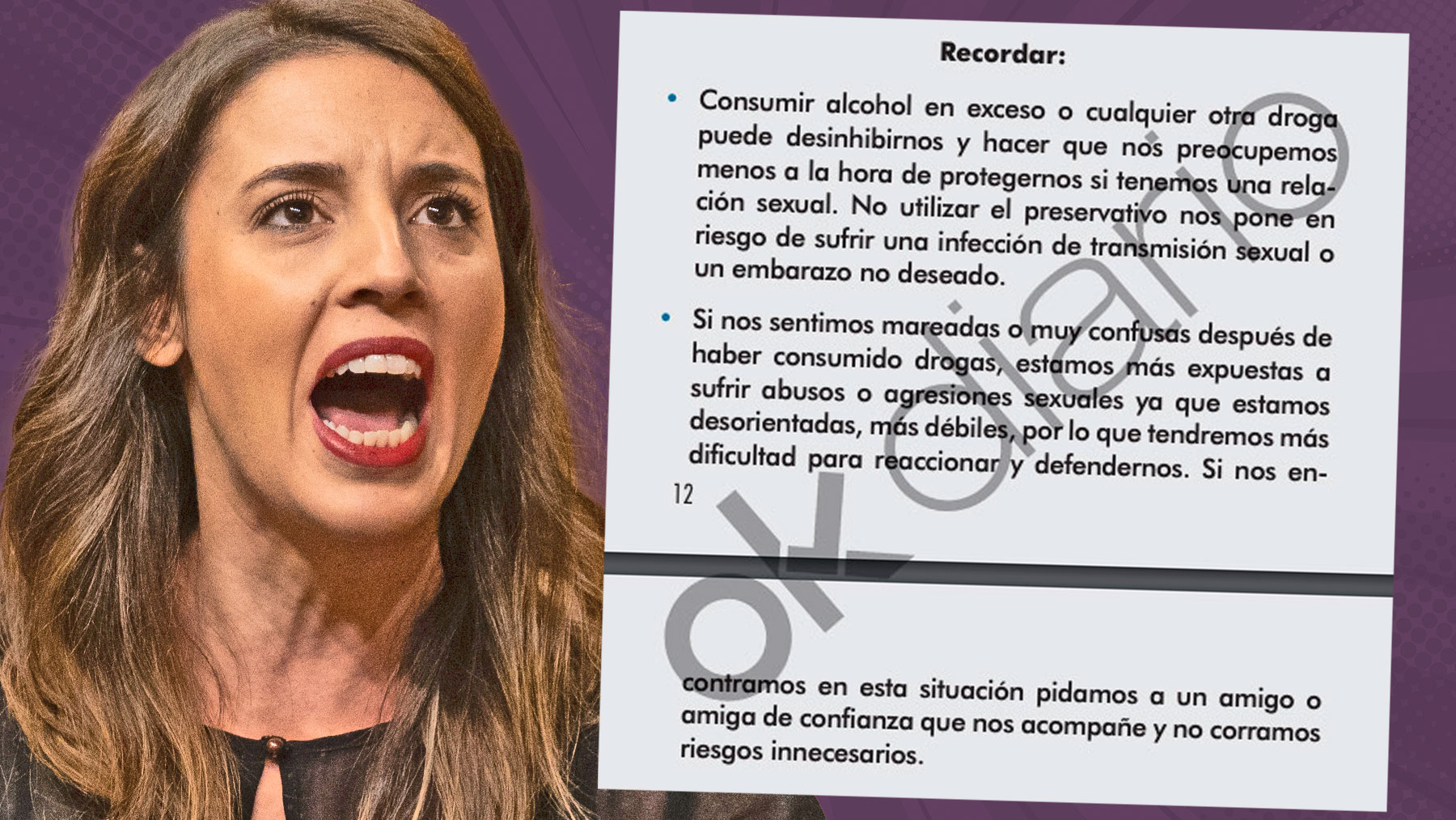 “¿Qué hacen ustedes? Una campaña en Galicia que dice no debería pasar, pero pasa; vigila tu copa al salir, en Madrid… Responsabilizar a las víctimas de agresiones. Promueven la cultura de la violación», aseveró el pasado miércoles Irene Montero a la bancada del Partido Popular, generando con sus palabras una gran bronca política. El PP ha reclamado su dimisión.