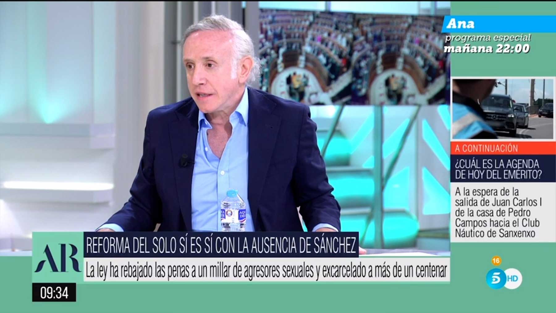 La imagen del día es la del escaño vacío del presidente del Gobierno. Una foto que ha tenido su correspondiente comentario en la tertulia de El Programa de Ana Rosa, donde Eduardo Inda ha recordado que Pedro Sánchez ha pedido perdón este fin de semana a las víctimas «por esta ley que ha puesto en libertad o ha beneficiado a 979 violadores y pederastas».