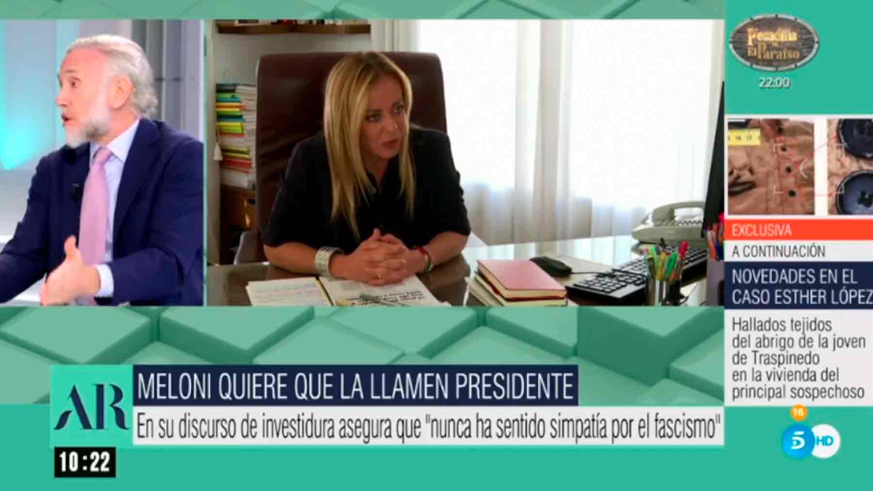 El director de OKDIARIO, Eduardo Inda, ha acudido este miércoles al programa de Ana Rosa, en Telecinco, para comentar la actualidad política. Uno de los temas del día ha sido la reciente toma de posesión de la primera ministra italiana, Giorgia Meloni.