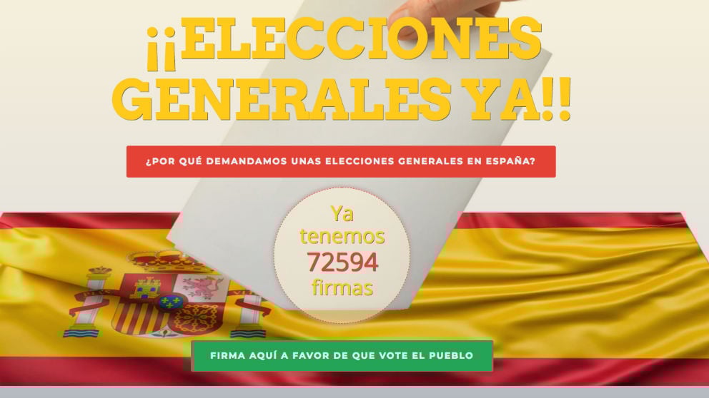 Una asociación ha logrado reunir en pocas horas más de 72.800 firmas para forzar al Gobierno de Pedro Sánchez a convocar elecciones anticipadas cuanto antes. El objetivo es alcanzar las 500.000 firmas, para poder tramitar esta petición en forma de Iniciativa Legislativa Popular (ILP) en el Congreso de los Diputados.