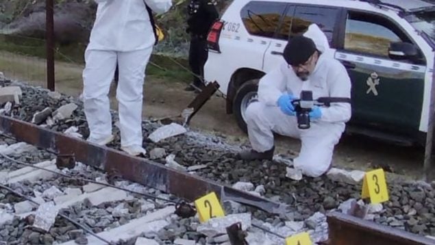 Como se aprecia en las imágenes que acompañan a estas líneas, los servicios de criminalística de la Guardia Civil han comenzado por rastrear la vía palmo a palmo en la zona del accidente, marcando en especial uno de los raíles de la vía en la que se ha desprendido un trozo del resto de la línea.