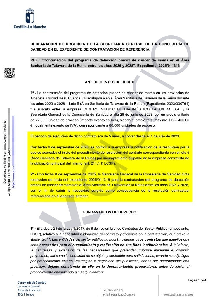 «Con fecha 8 de septiembre de 2025, la Secretaría General de la Consejería de Sanidad dicta resolución de inicio del expediente 2025/011316 para la contratación del programa de detección precoz de cáncer de mama en el Área Sanitaria de Talavera de la Reina entre los años 2026 y 2028, con el fin de cubrir la necesidad surgida como consecuencia de la resolución contractual referenciada en el apartado anterior», reza el expediente.