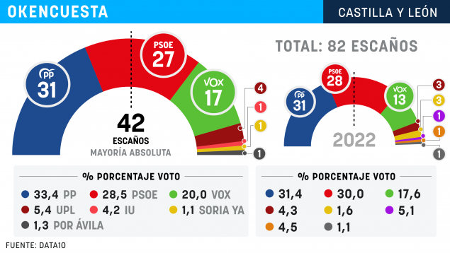 Con estos resultados en el sondeo, Mañueco seguiría necesitando a Vox para ser investido y gobernar, dentro de una mayoría abrumadora de la derecha en Castilla y León. El Partido Popular repetiría su resultado electoral de 2022, lo que les valdría para ganar las elecciones, pero la mayoría absoluta quedaría muy lejos, convirtiendo al partido liderado en la región por Carlos Pollán en clave para una potencial investidura.
