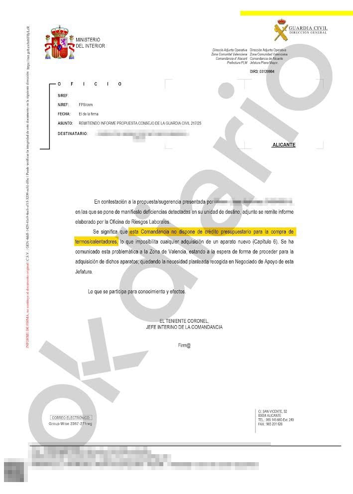 Dicho documento, al que ha tenido acceso OKDIARIO en exclusiva, fue remitido el pasado 17 de julio por el teniente coronel, que es el jefe interino de la comandancia, en respuesta a la misiva de una de las agentes afectadas denunciando esta deficiencia que sufren.