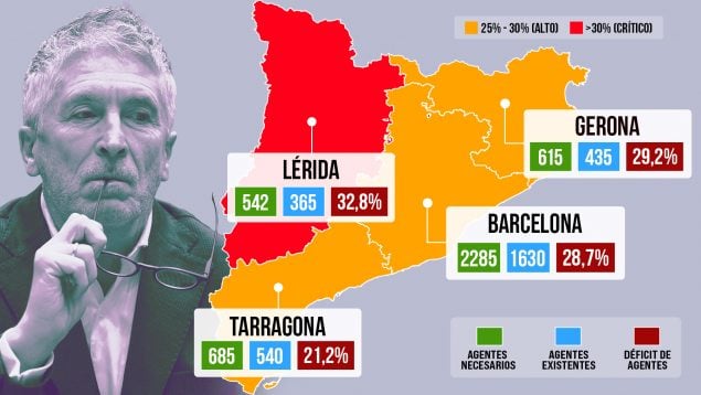 La provincia peor parada es Lérida, donde debería haber 542 agentes, pero apenas hay 364, por lo que Marlaska tiene sin cubrir el 32,8% de las plazas. A corta distancia le sigue Gerona, donde debería haber 615 guardias civiles, pero sólo hay 435, lo que supone un déficit del 29,26% efectivos.