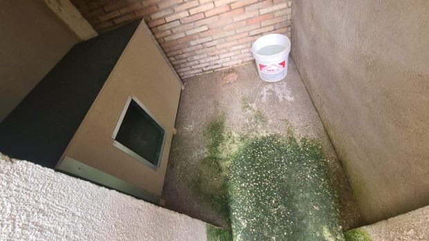 Las perreras se componen de una zona exterior y de una caseta de madera. Al moho y las reducidas dimensiones de los habitáculos se suma que a las instalaciones «nunca les da el sol» y, por ende, tampoco a los perros, dado que están situadas junto a un muro alto.