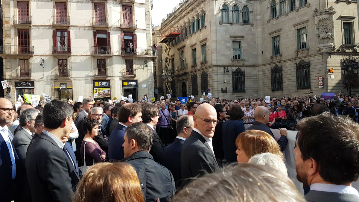 La concentración de este martes a favor de los presidentes de Omniun Cultural y ANC, Jordi Cuixart y Jordi Sánchez, encarcelados por la magistrada Carmen Lamela acusados de sedición, ha sido alentada abiertamente a través de medios oficiales. La Generalitat no ha dudado en enviar un correo electrónico a sus empleados para instarles a acudir a la protesta. Asimismo lo han hecho los decanos de algunas de las universidades catalanas y el sindicato CCOO.