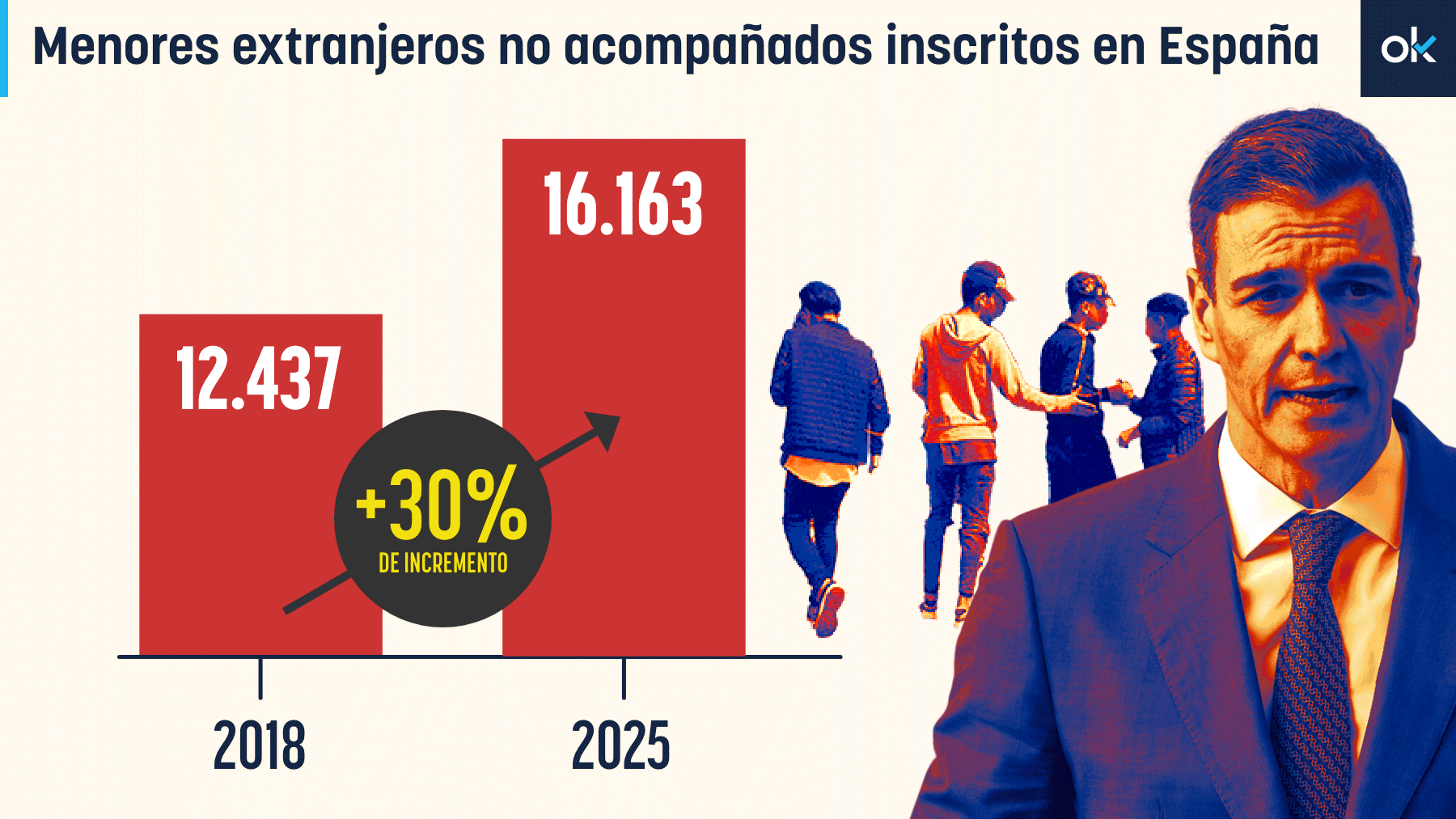 A finales de 2018, el número de menores extranjeros no acompañados acogidos o tutelados por los servicios de protección de las comunidades autónomas se situó en 12.437 menas. Ahora, tras seis años de mandato socialista, la cifra se ha elevado hasta los 16.163, creciendo en 3.726 menas.