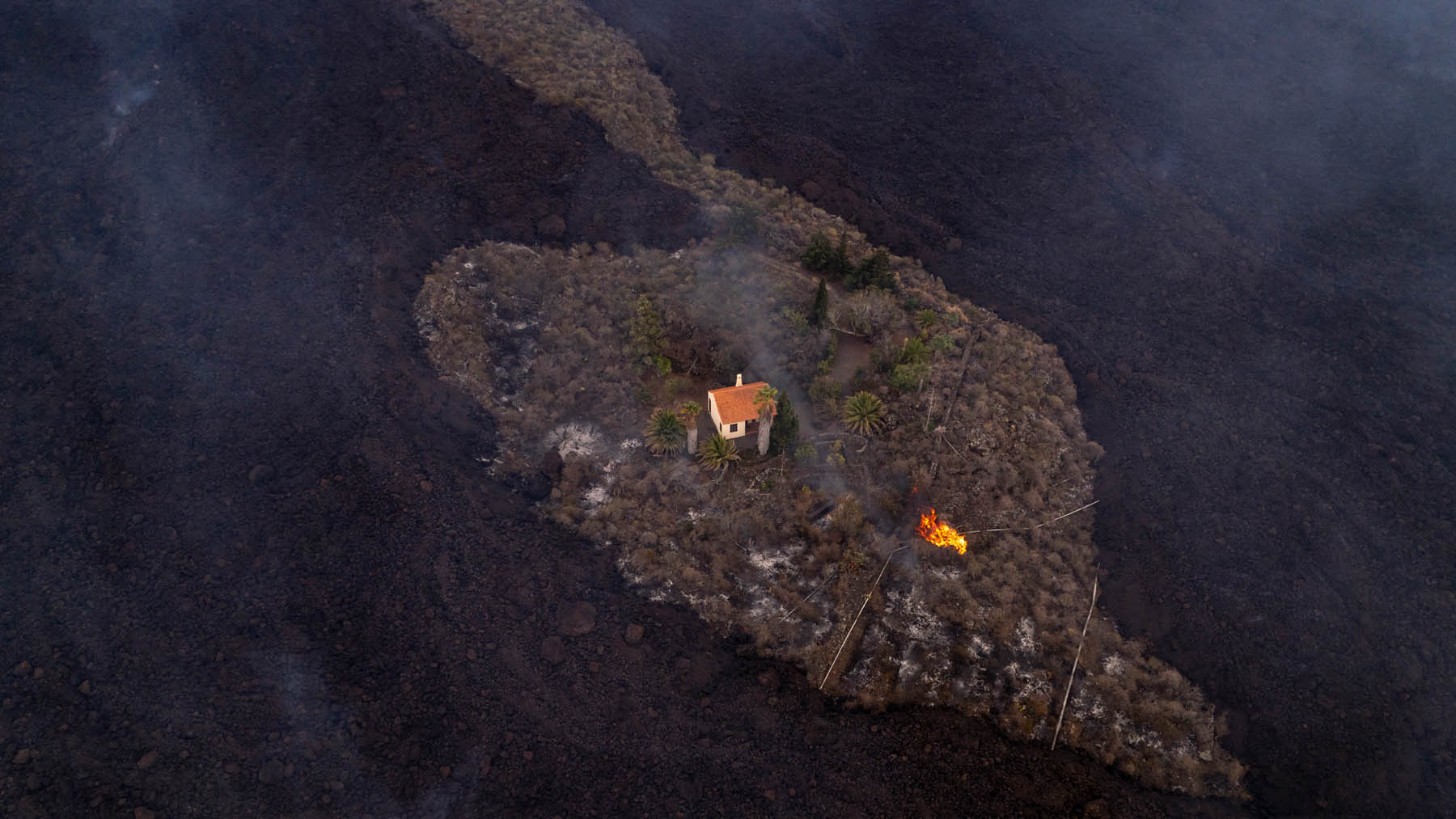 Los milagros no existen en La Palma. En la isla canaria quien manda es el volcán, imparable e imprevisible, con un incontenible río de lava que al final no ha perdonado a uno de los símbolos de la tragedia: la casa que sobrevivía inmutable entre la masa negra viscosa y ardiente que cae ladera abajo.