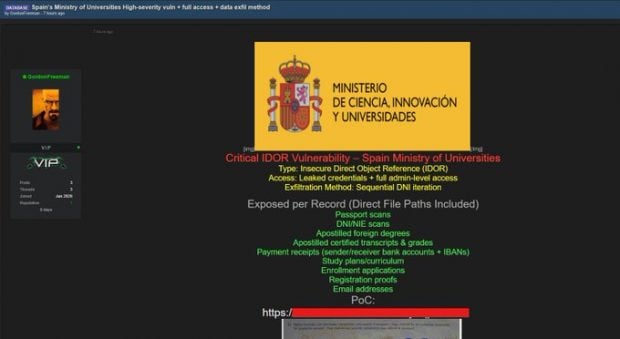 Horas después de que un hacker anunciara un ciberataque sobre el Ministerio de Ciencia de Diana Morant, la sede electrónica del ministerio permanece cerrada por una «incidencia técnica». El ladrón, o grupo de hackers denominado Gordon Freeman, se jactan de haber vulnerado los sistemas del ministerio con credenciales filtradas y muestran pantallazos de los datos personales y financieros de supuestos estudiantes dispuestos para su venta a las mafias de ciberestafadores.
