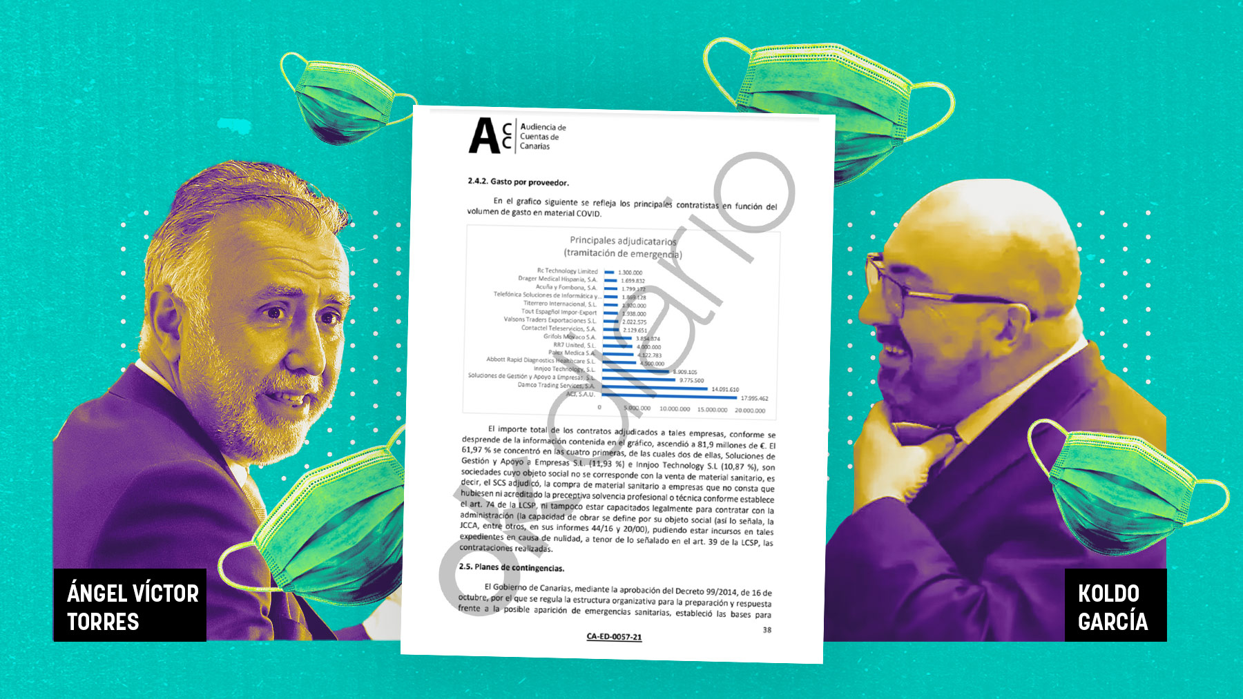 El Gobierno socialista de Canarias, presidido entonces por el ahora ministro de Política Territorial, Ángel Víctor Torres, fue alertado de las irregularidades en la contratación de la principal empresa investigada en la trama de mordidas, por la que ha sido detenido Koldo García, ayudante del ex ministro y ex número 2 del PSOE José Luis Ábalos. Un informe de la Audiencia de Cuentas de Canarias (el Tribunal de Cuentas canario), que Torres ordenó ocultar, advertía de la dudosa legalidad del contrato adjudicado a Soluciones de Gestión y Apoyo a Empresas S.L. por el que recibió más de 9,7 millones de euros pese a tratarse de una sociedad cuyo objeto social no era el material sanitario, campo en el que carecía de experiencia. Sin embargo, la Administración autonómica presidida entonces por el hoy ministro la convirtió en la tercera empresa con más contratos de urgencia recibidos por el Covid. Se llevó el 11,93% de la inversión.