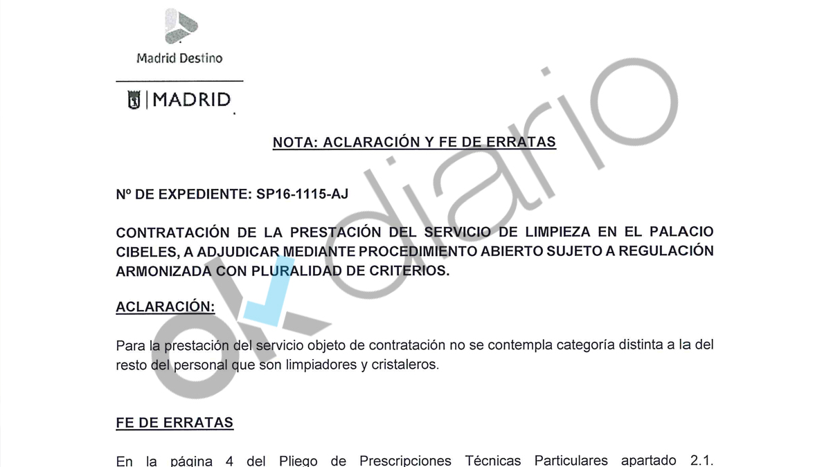 El concurso abierto para adjudicar la limpieza del Palacio de Cibeles incluyendo un “auxiliar de cocina” exclusivo para Alcaldía vive un giro de los acontecimientos. Este jueves 12 de enero se ha incorporado una “aclaración y fe de erratas” en la licitación. Se suprime en ella este puesto que iba a trabajar 35 horas semanales de 10:00 a 17:00.