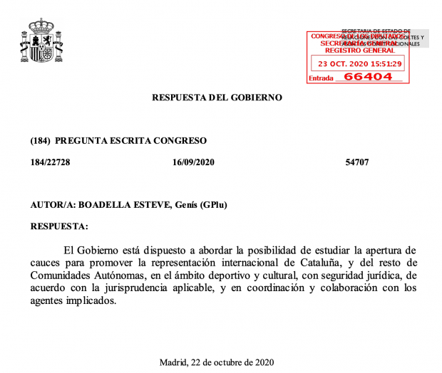 En su contestación, y empleando los mismos términos, el Gobierno reitera que «está dispuesto a abordar la posibilidad de estudiar la apertura de cauces para promover la representación internacional de Cataluña, y del resto de comunidades autónomas, en el ámbito deportivo y cultural, con seguridad jurídica, de acuerdo con la jurisprudencia aplicable, y en coordinación y colaboración con los agentes implicados».