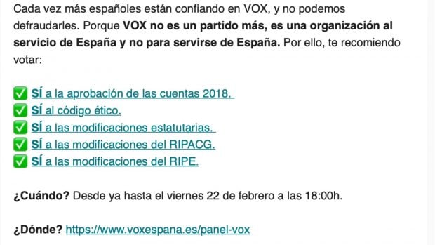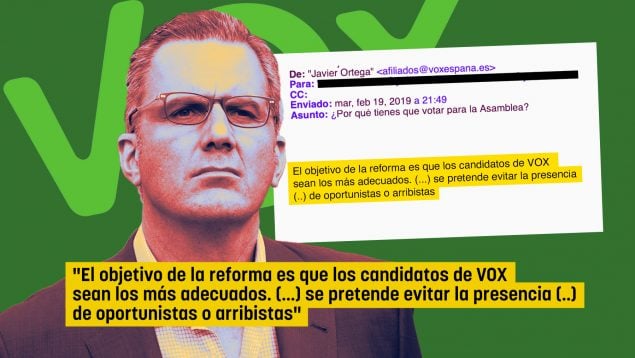 «El objetivo de la reforma, de cara a las próximas citas electorales, es que los candidatos de Vox sean los más adecuados por su formación y por su integridad», expuso en un email remitido a todos los afiliados de España. En él indicaba exactamente qué tenían que votar en aquella asamblea de 2019, una de las más determinantes para Vox teniendo en cuenta que estaban a punto de convocarse elecciones generales y la formación, según sus propios sondeos internos, proyectaba un crecimiento exponencial en los comicios.
