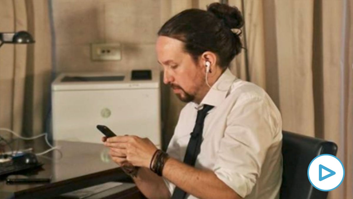 Pablo Iglesias, vicepresidente segundo del Gobierno y líder de Podemos, posando con su icónica coleta recogida con un moño y con gesto serio mientras interactúa con su móvil conectado con unos casos. Así es la imagen que ha colgado el propio dirigente podemita en su perfil de Instagram y que se ha vuelto viral por posar con una apariencia inédita hasta ahora.
