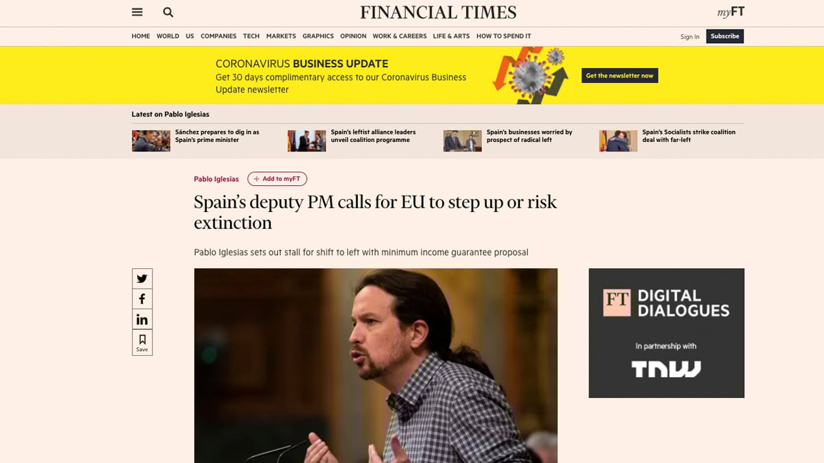 Así ha respondido el vicepresidente y líder de Podemos al ser preguntado en el Financial Times sobre la gestión del Gobierno en la fase previa a decretar el estado de alarma a mediados de marzo, cuando comenzó a expandirse el virus.