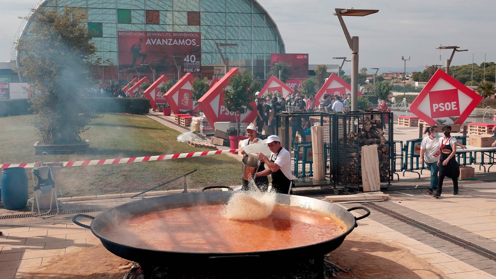 Largas colas en la esplanada de la Fira de Valencia para conseguir uno de los miles de platos de paella gratis que el PSOE ha repartido en la jornada inaugural de su Congreso Federal. Es lo que toca en la capital de uno de los platos más reconocidos de nuestra gastronomía a nivel internacional. Aunque a juzgar por la opinión de algunos valencianos que la han probado, pocos le darían la categoría de paella. Opinión bien distinta tenían los representantes de otras federaciones que saboreaban con gusto el arroz que ha preparado una empresa de catering, desde primera hora, en dos grandes paelleras que han depositado con una grúa. La última vez que hubo paella en el PSOE fue el 1 de octubre de 2016, en el fatídico comité federal de Ferraz, que provocó la caída de Pedro Sánchez. Entonces fue una acción promocional de una inmobiliaria.