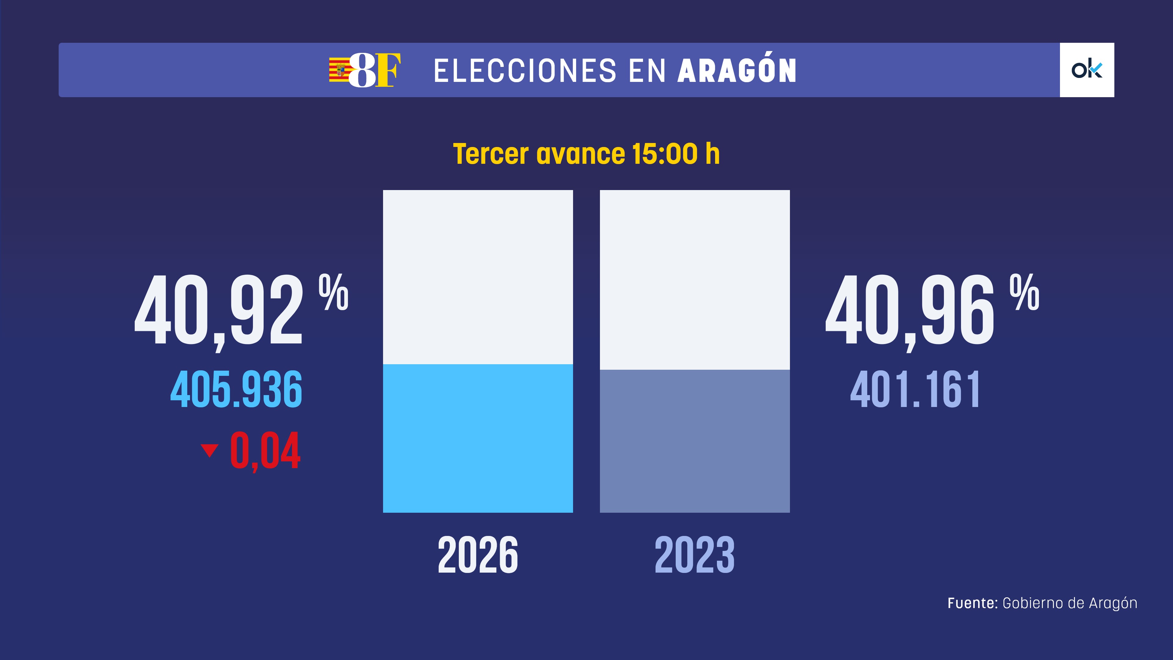 El 40,92% de los aragoneses con derecho a voto han votado ya a las 14:00 horas de la tarde, según los datos oficiales ofrecidos por el Gobierno de Aragón. La participación, en esta jornada electoral ha bajado apenas 0,04 puntos con respecto a las elecciones autonómicas celebradas en 2023, en las que, a las 14:00 horas se registró una participación del 40,96%, con un total de 401.161 votos emitidos.