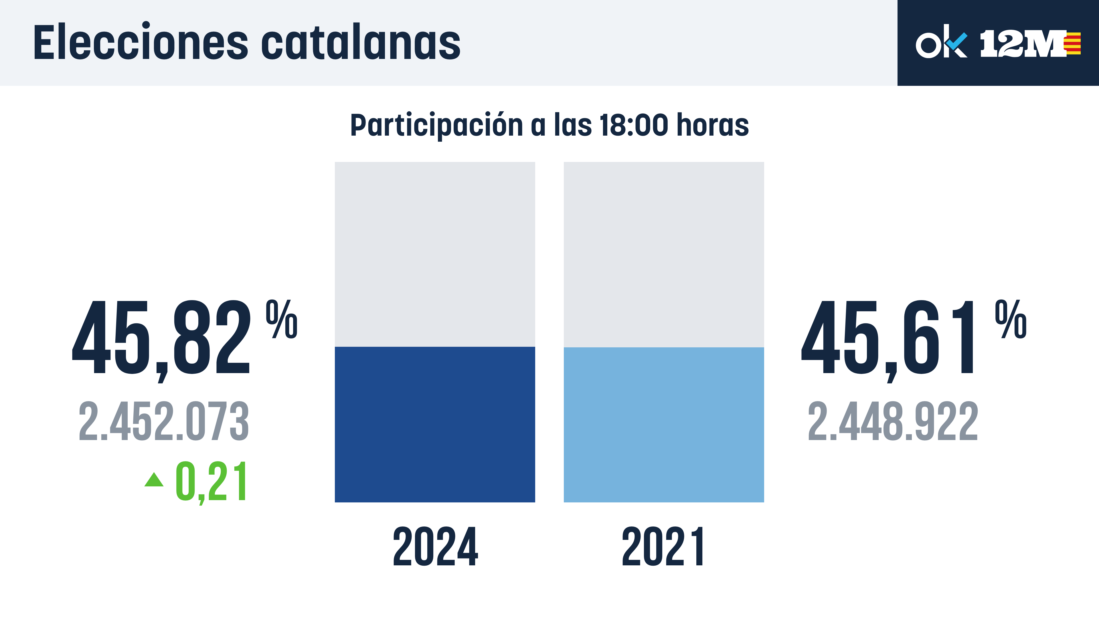 La participación en las elecciones de Cataluña de este domingo se ha situado a las 18:00 horas en el 45,82% del censo, casi idéntica a la que se registró en los comicios autonómicos de 2021, cuando habían ejercido su derecho a voto el 45,61 % de los ciudadanos. Ahora, el nivel de participación está dos décimas por encima.