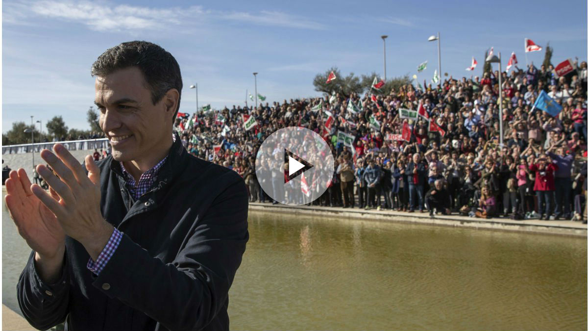 «Veo que hay agua en la piscina», dijo Sánchez al inicio de su intervención. Con ello se refería no sólo al lago que rodea el auditorio en el que finalmente se ha celebrado el acto –previsto en un principio en el pabellón municipal del Parque Científico y Tecnológico–, sino a los militantes que le acompañaban, unos 1.500, según la organización, a quienes les ha dicho que «será un orgullo» liderar su «causa» para dar una «lección de libertad y autonomía política».