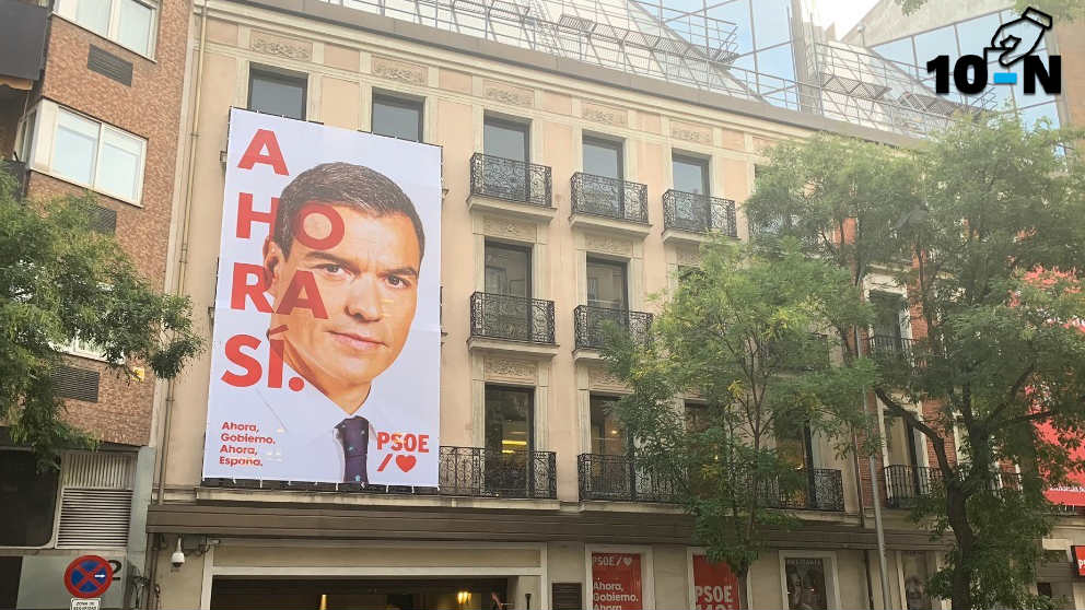 Pedro Sánchez ha borrado «España» del lema de campaña del PSOE para el 10-N y lo ha dejado reducido a «Ahora, sí». Una gran pancarta cubre ya Ferraz desde primera hora de hoy, ilustrada con una enorme fotografía del líder del partido.