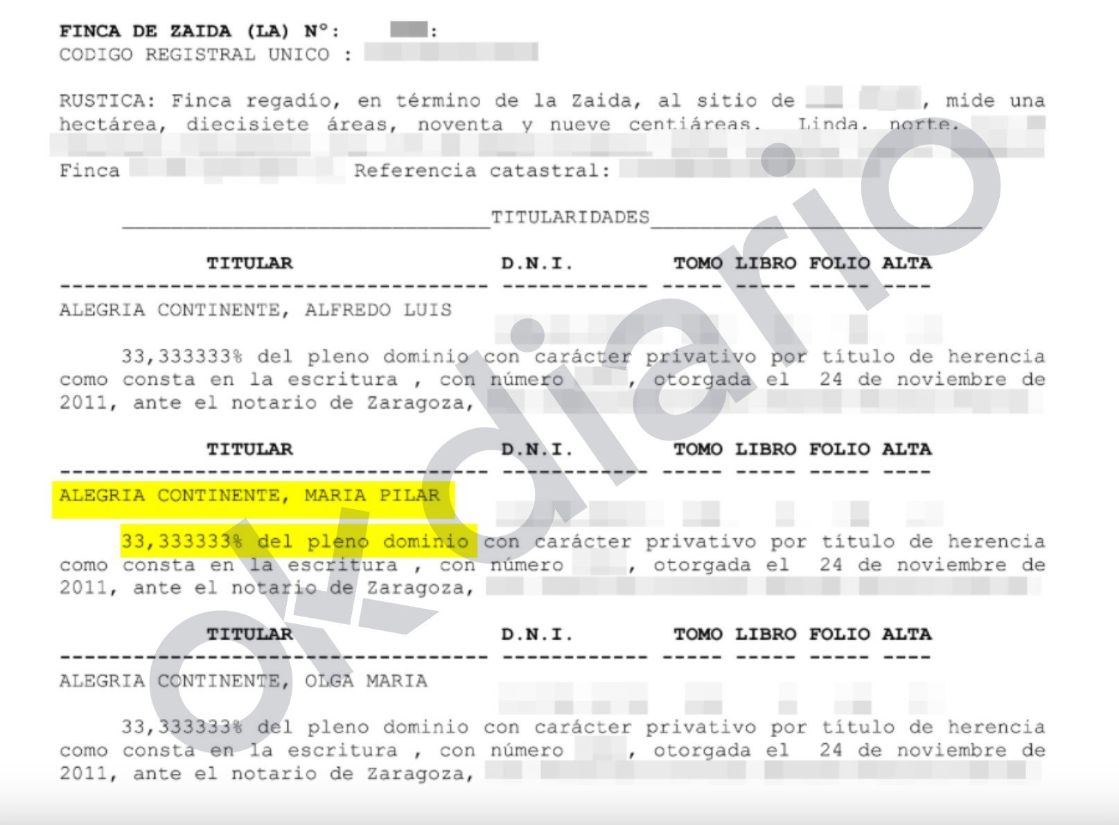 La candidata socialista al 8F figura como propietaria de dichos porcentajes en las tres fincas de regadío tras adquirir el «pleno dominio con carácter privativo por título de herencia», según consta en la escritura con fecha de 24 de noviembre de 2011. Por aquel entonces, Alegría era ya diputada del PSOE en el Congreso por Zaragoza, pero tampoco recogió ser dueña de parte de estos terrenos, a diferencia del proceder de otros parlamentarios con esta declaración de bienes, donde sí reflejaron estas fincas rústicas.