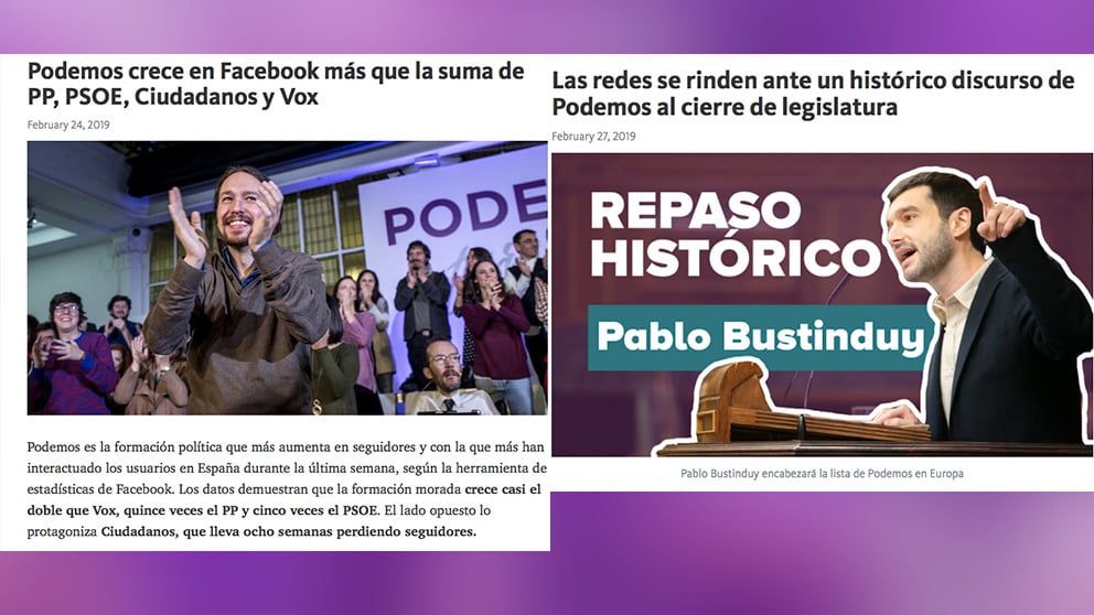 En el texto se hacía mención a los buenos resultados de Podemos en Facebook, sin tener en cuenta, por ejemplo, que en Instagram el líder de VOX, Santiago Abascal, tiene más seguidores que Iglesias. «Los datos demuestran que la formación morada crece casi el doble que Vox, quince veces el PP y cinco veces el PSOE. El lado opuesto lo protagoniza Ciudadanos, que lleva ocho semanas perdiendo seguidores», se puede leer en la noticia. Junto al texto, una imagen del líder del partido con actitud sonriente y gesto triunfante.