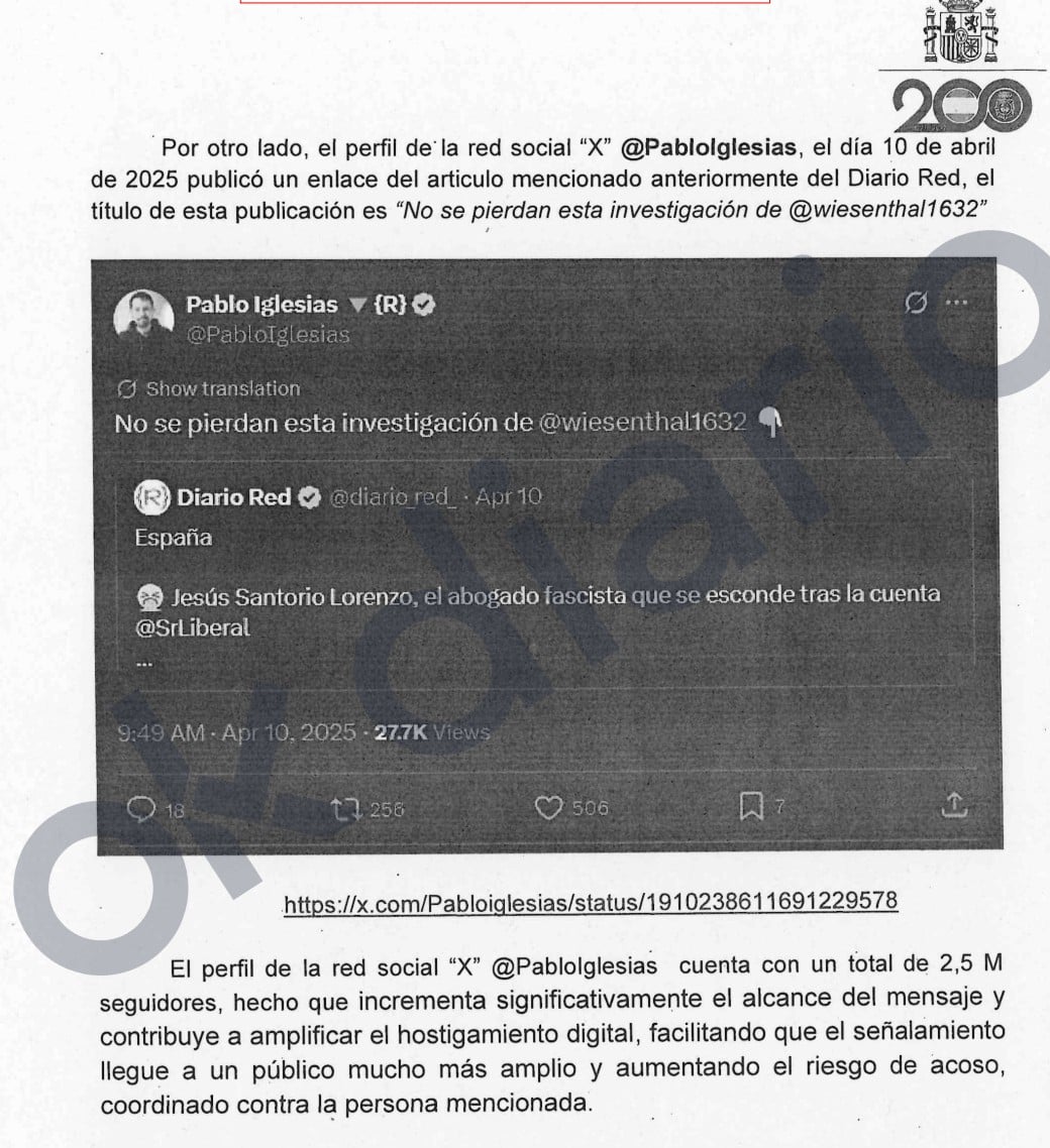 La Brigada Provincial de Información del Cuerpo Nacional de Policía de Madrid ha elaborado un informe —incorporado a un sumario que instruye desde 2025 el Juzgado de Instrucción número 3 de Móstoles— en el que constata que el perfil de la red social X @PabloIglesias, con 2,5 millones de seguidores, publicó y amplificó contenido que identificaba plenamente a un abogado por su nombre y apellidos, vinculándolo a una campaña que los investigadores policiales califican de acoso y discriminación ideológica.