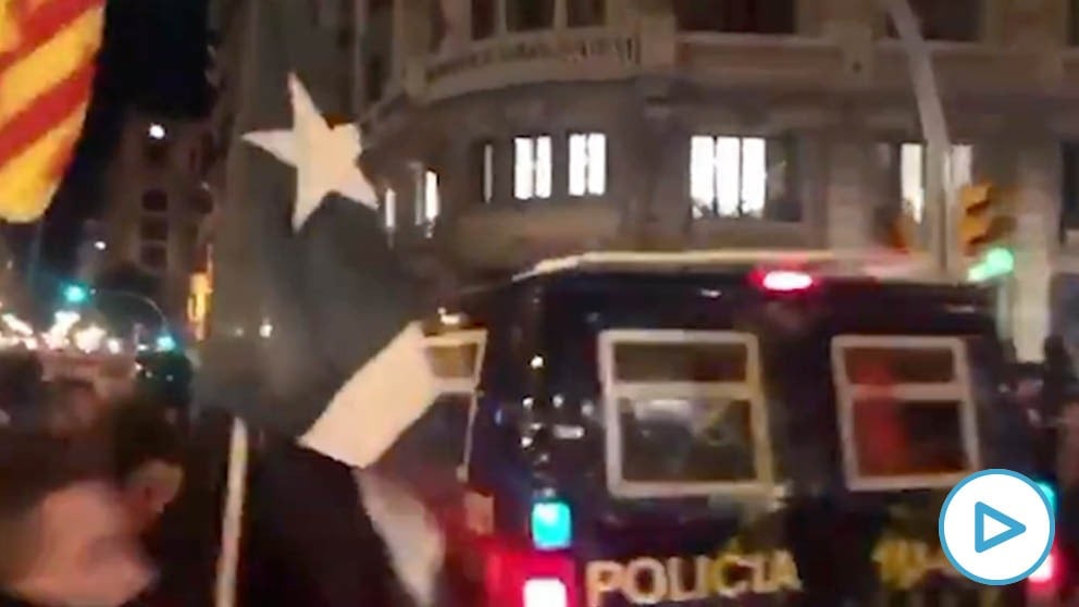 En pleno acoso, y bajo gritos de «¡Hijos de Franco!» y «¡A por ellos!», una parte importante de las 10.000 personas que rodeaban la Jefatura Superior de Policía de Barcelona comenzaron a zarandear los vehículos y a lanzarles vallas. Mientras, los Mossos trataban de ayudarles abriendo un corredor lateral desde una calle adyacente hasta los vehículos.
