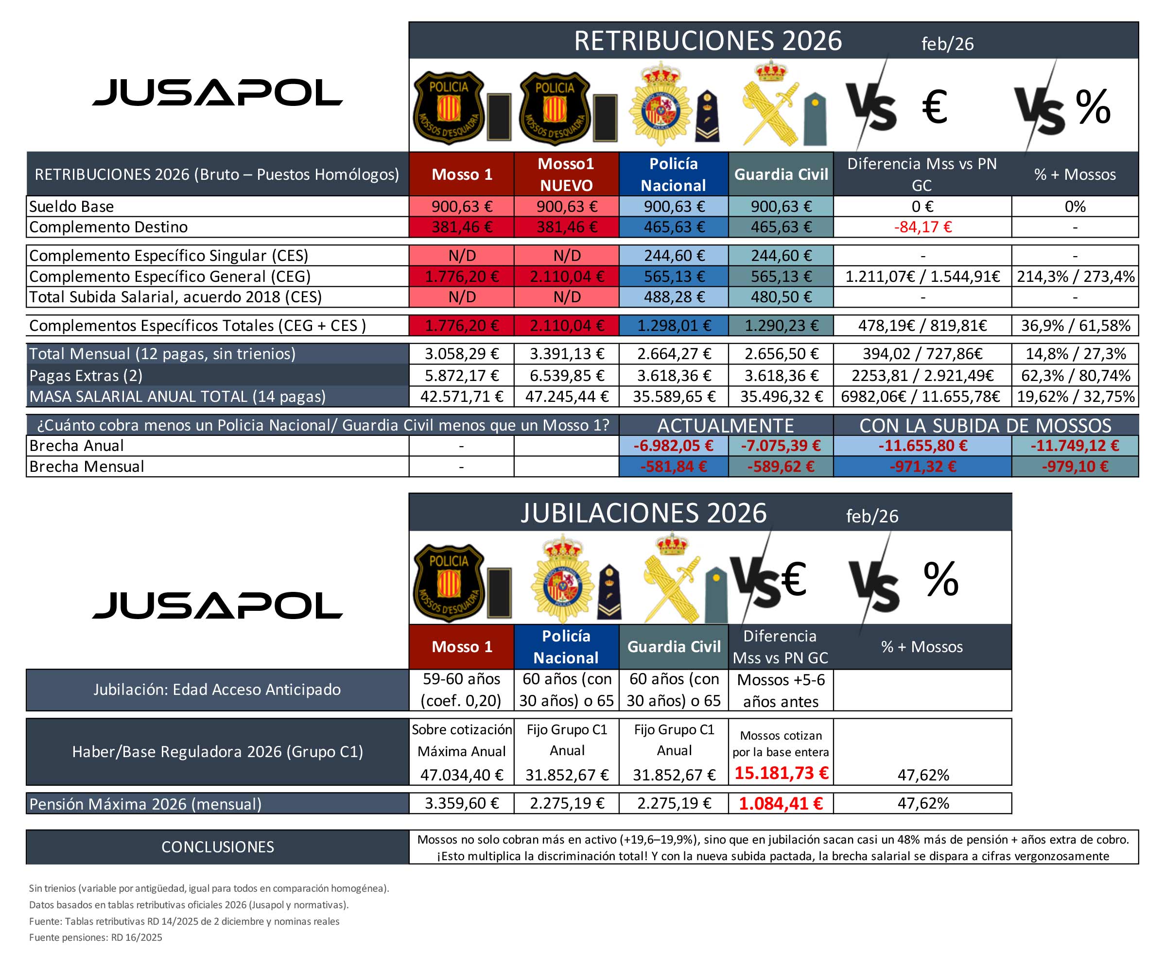 Los mossos no sólo cobran más en activo que policías y guardias civiles –un 19,6 y un 19,9% más respectivamente–, sino que cuando se jubilan tienen un 48% más de pensión que estos otros dos Cuerpos policiales, así como más años extra de cobro, ya que pueden jubilarse de forma anticipada, lo que todavía «multiplica más la discriminación», denuncia Jusapol.