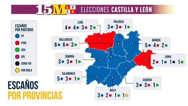 El Partido Popular de Alfonso Fernández Mañueco se había propuesto igualar los números de Juan José Lucas y Juan Vicente Herrera, los dos únicos candidatos que lograron ganar en las nueve provincias en unas elecciones autonómicas en Castilla y León. La candidatura popular en estas elecciones del 15M ha estado muy cerca de lograrlo. Sólo ha quedado como segunda fuerza en León y en Soria, donde el PSOE ha sido el partido más votado. En las últimas generales, las celebradas en julio de 2023, la formación de Alberto Núñez Feijóo logró pintar de azul toda esta región.