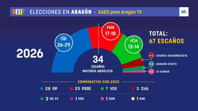 De esta manera, los ‘populares’ tendrían que volver a pactar con Vox o intentar una combinación con la Chunta en la horquilla más alta de ambas formaciones para llegar a los 34 escaños de la mayoría absoluta (de un total de los 67 diputados en liza). Con estos datos, Aragón Existe, que mantendría sus 3 diputados como quinta fuerza, también podría jugar un papel clave en la gobernabilidad de esta comunidad.