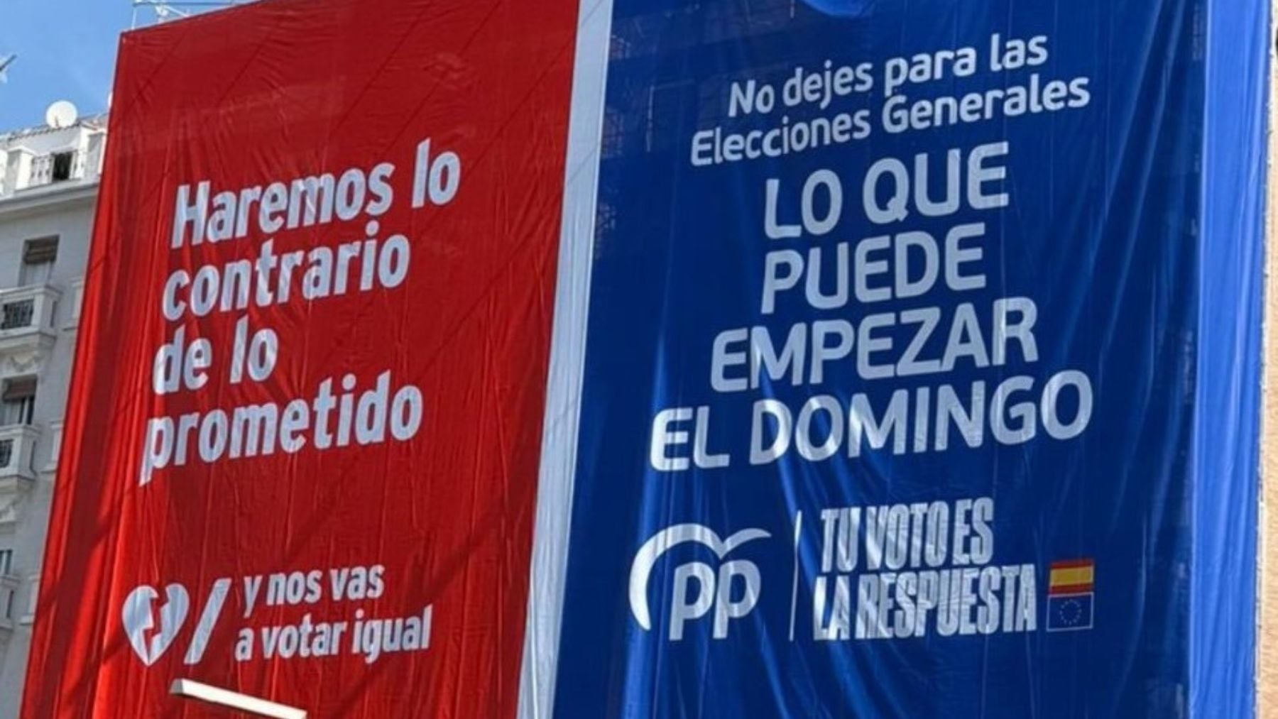 El PP ha colocado una lona en Madrid para trolear al presidente del Gobierno, Pedro Sánchez. El cartel se divide en dos mitades, una parte se hace pasar por un anuncio electoral del PSOE, y el otro es, realmente, un mensaje de campaña del PP. La parte que imita un cartel socialista reza «haremos lo contrario de lo prometido y nos vas a votar igual».