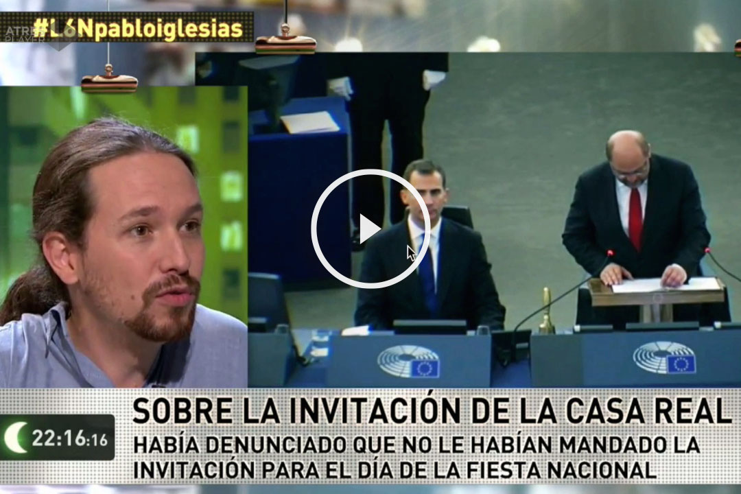 El presentador pregunta sobre la actuación de los representantes de Podemos durante la primera intervención del monarca en el Parlamento Europeo, cuando varios miembros de Izquierda Unitaria mostraron pancartas, banderas republicanas y algunos decidieron abandonar el hemiciclo antes de que el rey comenzara su discurso.