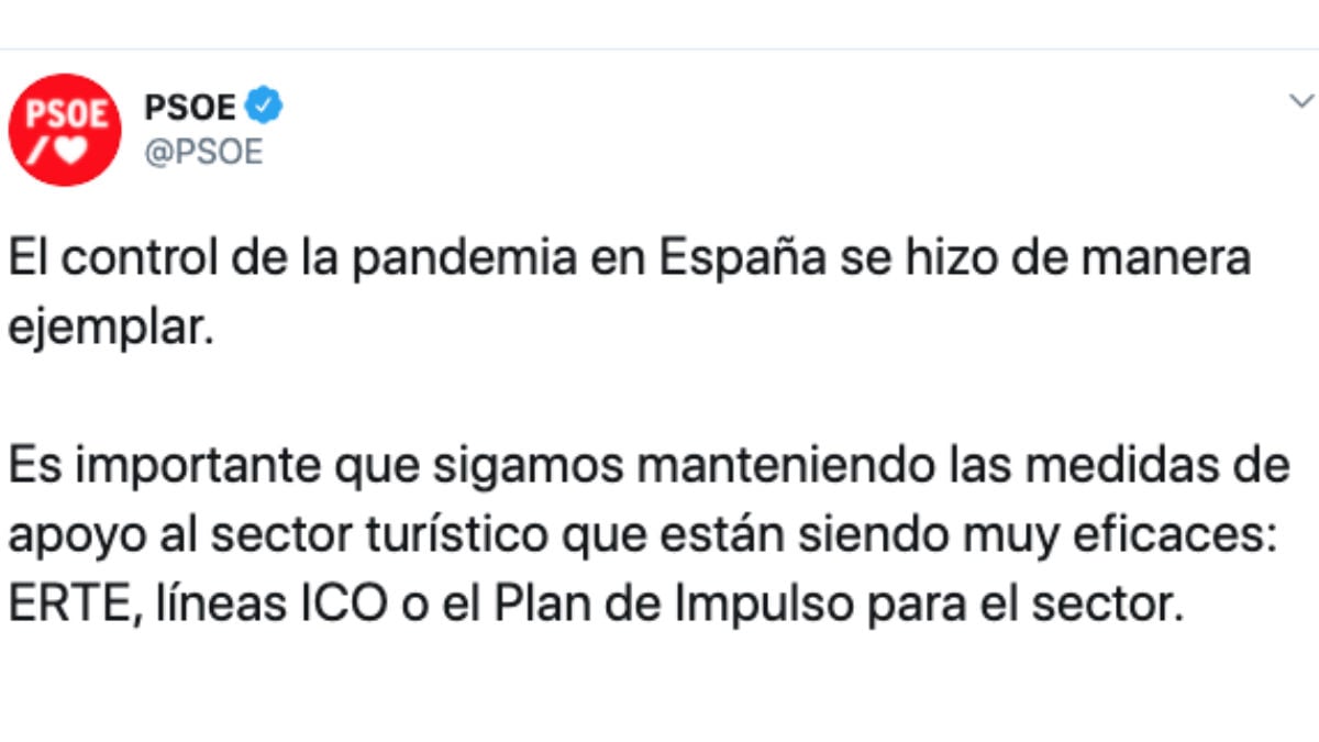 El partido de Pedro Sánchez ha hecho suyas unas declaraciones de Reyes Maroto, ministra de Industria y Turismo, concedidas este jueves a la cadena Ser. La ministra ha defendido las medidas adoptadas por su Ejecutivo para sostener al sector turístico, uno de los pilares de nuestra economía y que está siendo fuertemente afectado por la crisis sanitaria.