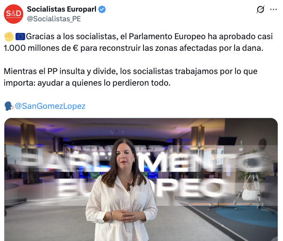 En la publicación que incluye el citado vídeo en el perfil de X de Socialistas PE (Parlamento Europeo), la formación sostiene que: «Gracias a los socialistas, el Parlamento Europeo ha aprobado casi 1.000 millones de € para reconstruir las zonas afectadas por la DANA». Es decir: una vez más, los socialistas se olvidan de que el organismo que aprobó esa ayuda de 946 millones fue la Comisión Europea y se arrogan la iniciativa a ellos mismos.