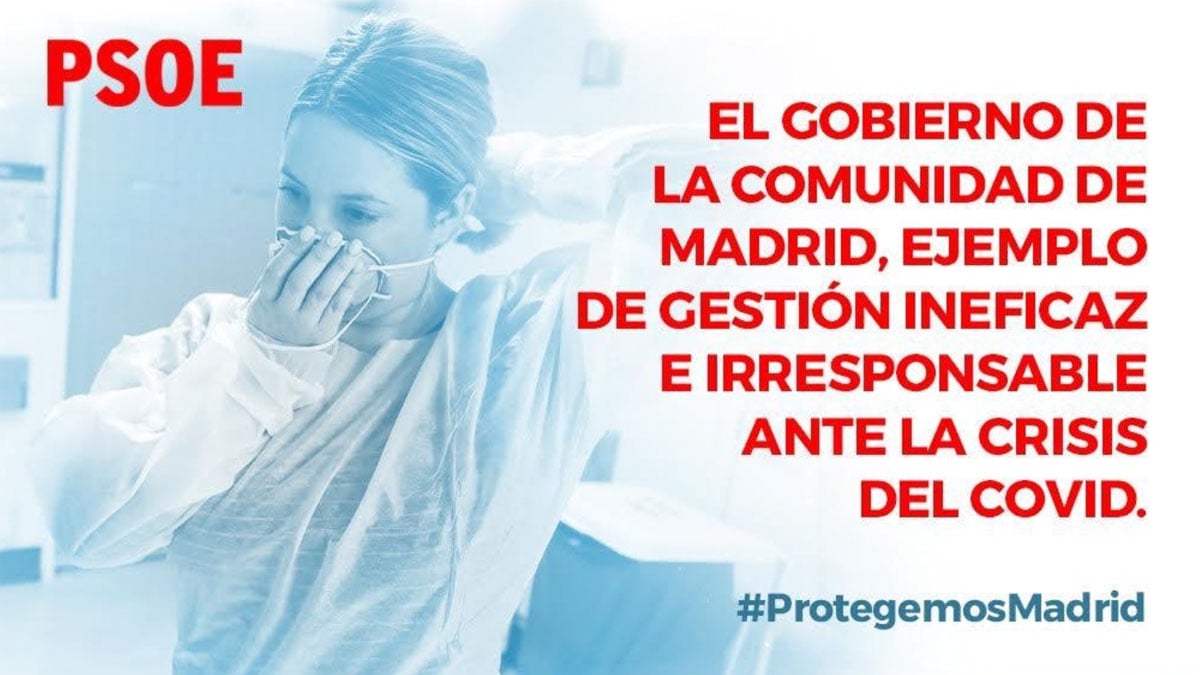 El Partido Socialista ha difundido un mensaje en sus redes sociales en el que esgrumen lo siguiente: «El Gobierno de la Comunidad de Madrid, ejemplo de gestión ineficaz e irresponsable ante la crisis del Covid», acompañado del slogan «Protegemos Madrid», asumiendo que son ellos los que están por la labor de proteger a la Comunidad frente al Gobierno autonómico, del Partido Popular.