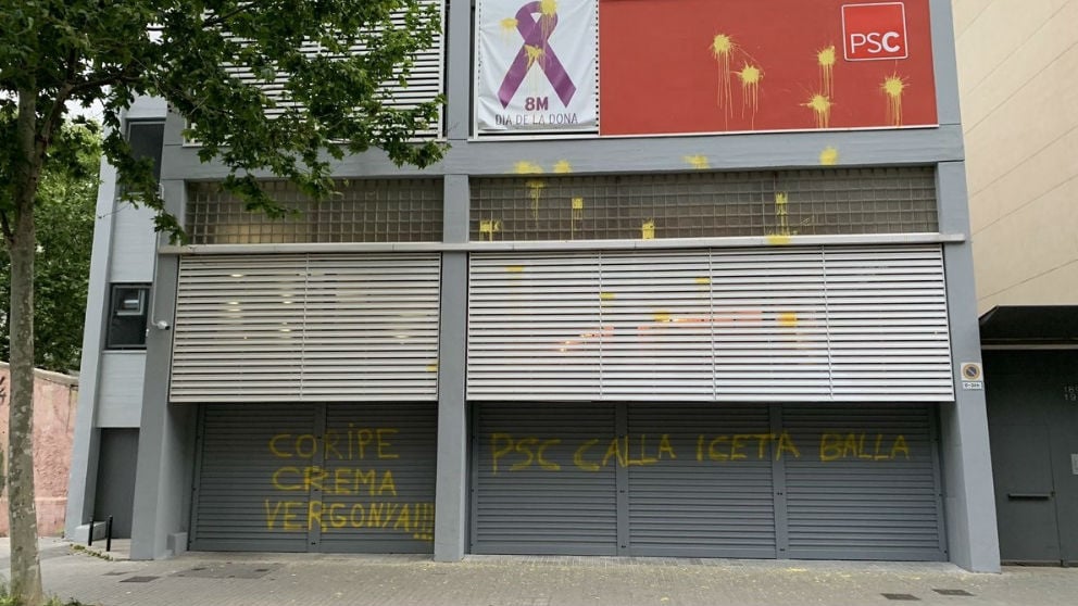 La sede del PSC de Poble Nou (Barcelona) ha amanecido este lunes con pintadas amarillas en las que se puede leer ‘Coripe Arde Vergüenza’ en referencia al pueblo sevillano donde se disparó y quemó un muñeco que representaba al expresidente Carles Puigdemont.