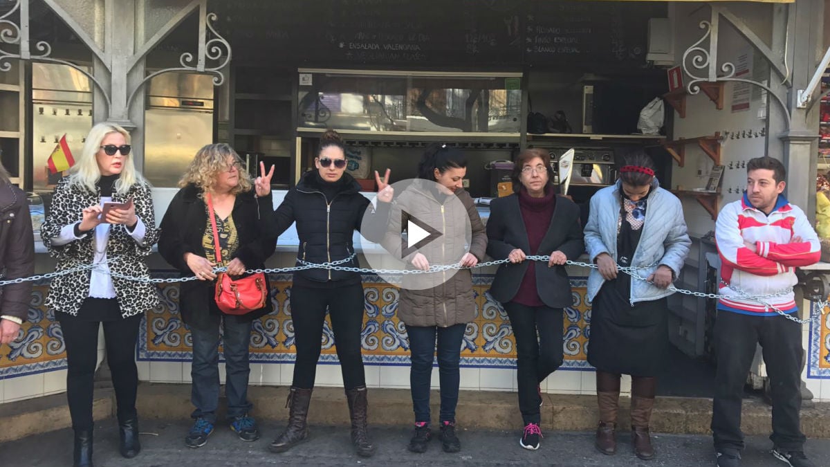 Los trabajadores del bar Supergourmet, situado en el Mercado Central de Valencia, se han encadenado la mañana de este miércoles para impedir el cierre del negocio, que da empleo y sustento a 10 familias, ordenado por el Ayuntamiento de Valencia.